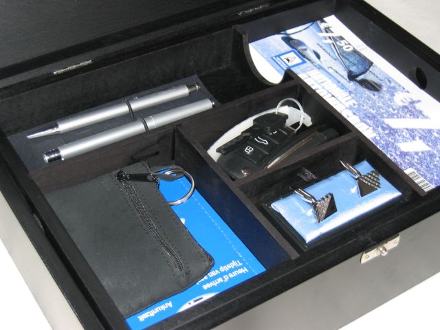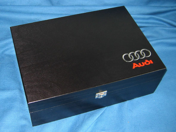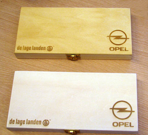 Nevenstaand een voorbeeld van een carwash voucherbox, die meestal in de auto word bewaard. De logo's zijn gelaserprint. Het bovenste doosje voorzien van een blanke lak en de onderste voorzien van een white wash finish. |
